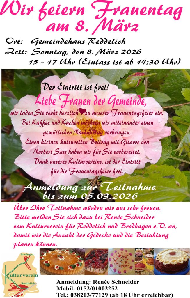 Wir laden Sie herzlich zu unserer Frauentagsfeier am 8. März 2026 ins Reddelicher Gemeindehaus ein.