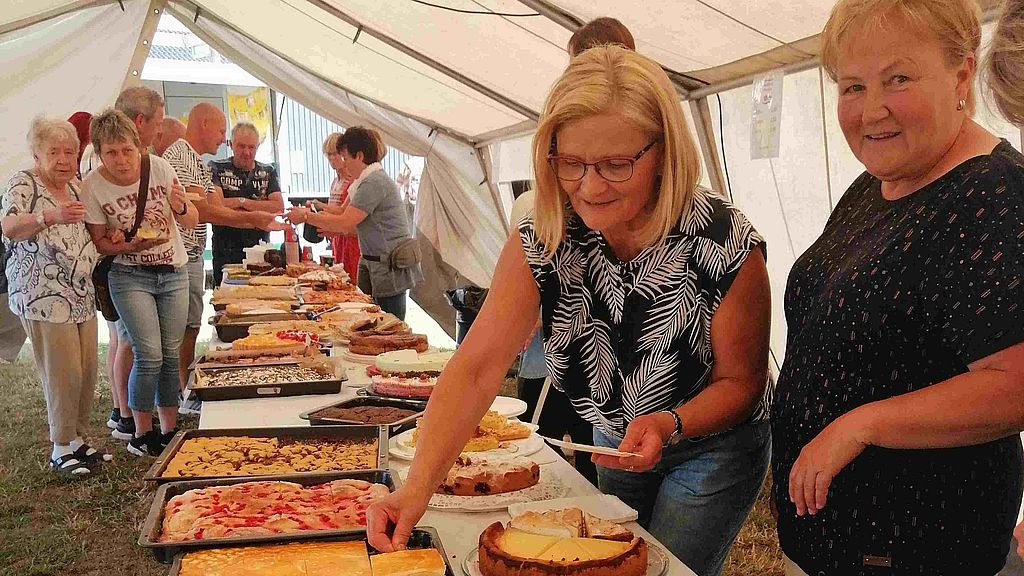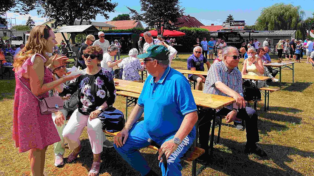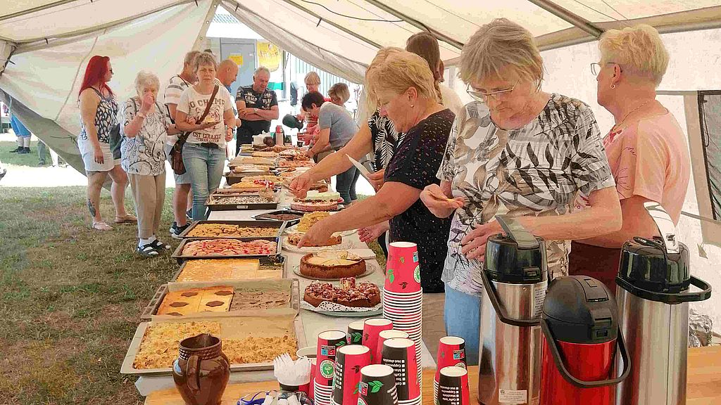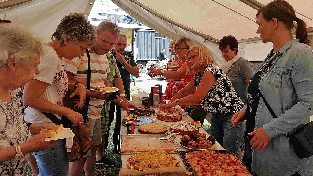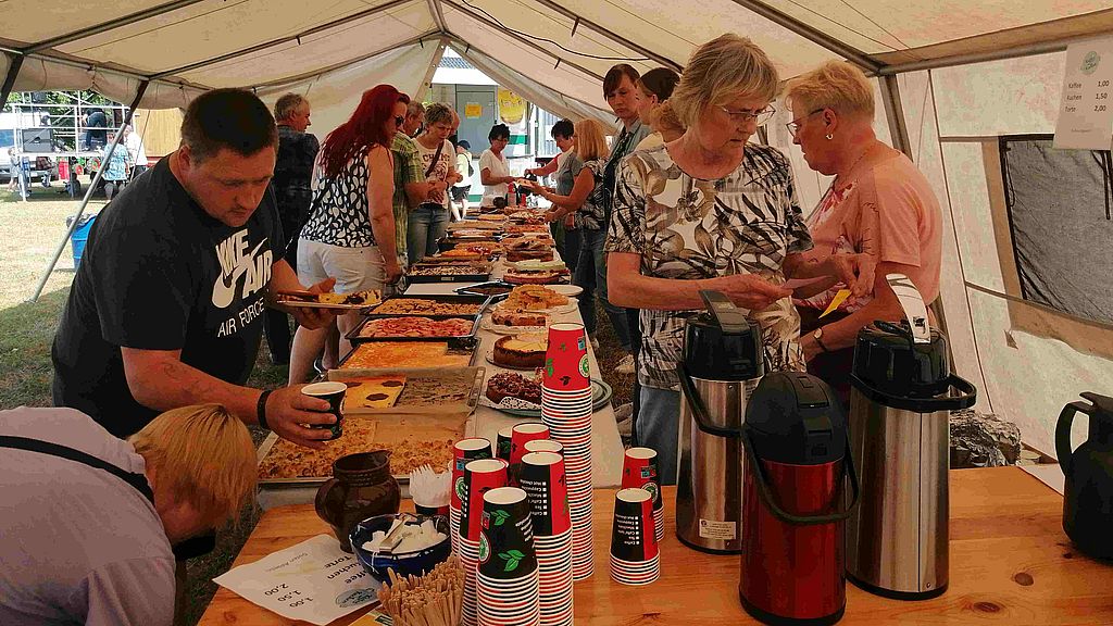 Los ging es mit dem Festumzug mit historischen und modernen Fahrzeugen, Traktoren, Landmaschinen, Feuerwehr, Mofas usw. Das Bad Doberaner Blasorchester musizierte dazu tolle Blasmusik und saß auf einem der Fahrzeuge des Trosses. Die Eröffnungsrede auf dem Festplatz hielt Andreas Elmer als stellvertretender Bürgermeister, der mit Leib und Seele das Dorffest als Vereinsmitglied und als Koordinator managte. Im Kaffee- und Kuchenzelt wurden wieder die leckeren selbstgebackenen Torten, Kuchen und Kaffee verkauft, die unsere Frauen und Männer gebacken haben. Hier lag schon viele Liebe und Fantasie drin. Edle Zutaten wurden verbacken. Das sahen und schmeckten wir. Der Kuchenbasar ist immer ein besonderer Höhepunkt. Die Einnahmen daraus werden vom Kulturverein wieder in gemeinnützige Projekte für die Menschen unserer Gemeinde verwendet.