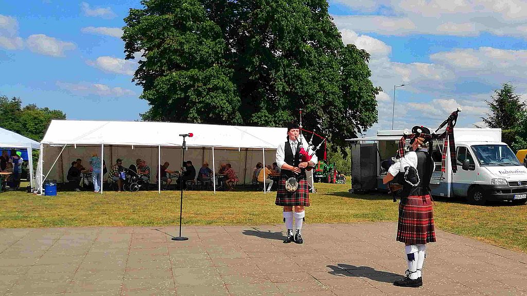Die Kita „Rohrspatzen“ aus Reddelich traten dann auf, sangen fröhliche Lieder. Danke richten wir an die Kinder und die Erzieherinnen. Dann erklangen schottische Klänge mit Dudelsack. Zwei Musikerinnen der Gruppe „Clan MacLanborough Pipes & Drums“ spielten die besondere Musik, die wunderbar zu unserem Dorffest passte. Dann tanzten wieder die Kinder der Tanzgruppe Fantasia mitreißende Tänze und erfreuten das Publikum. Es gab Zuckerwatte, Eis, Crepes, Gegrilltes und Spanferkel mit Sauerkraut, Bier vom Faß, Schorle, Brause. Dies alles konnte auch genossen werden und der Durst konnte gestillt werden. Für alle gab es etwas zu schauen, alte Schulfreunde zu treffen, mit ehemaligen Kollegen und Nachbarn zu lachen und Menschen zu sprechen, die man nur einmal im Jahr auf dem Dorffest sieht. Viele Neuigkeiten wurden ausgetauscht. Bernd Lahl verkaufte die Reddelicher Dorfchronik und alte Ausgaben der Dorfzeitung „Raducle“. Die Tombola wurde veranstaltet. Die drei Hauptgewinne waren ein Spanferkelessen für 25 Personen, ein Outdoor-Spaß und ein großer Brennholzhaufen für den Kamin. Karussels, Pferdewagen, Schießbude und Hüpfburg waren zum sportlichen Vergnügen vorhanden. Um 20 Uhr spielte die „Pegasus Horse Band & DJ Dirk Rath“ Livemusik zum Tanzen. Schöne Schlager wurden gesungen und es machte einfach Spaß zu tanzen oder zuzuschauen. Die Riesenmettwurst von 1,55 Meter Länge sponserte Fleischerei Hackendahl. Sie wurde schließlich für 275 € versteigert. Der Erlös wird zum Kauf der mobilen Waschstation für das Kinder- und Jugendzeltlager der Kinderfeuerwehr verwendet. Die Moderation von Rainer Elmer gefällt uns dabei prima.